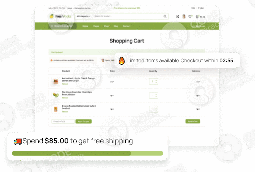 Propel your sale growth by utilizing neat shopping cart countdown, free shipping progress bar elements and lots more.